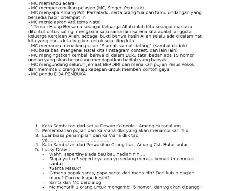Contoh teks naskah pembawa acara ( mc ) yang baik dan benar pembawa acara ( mc ) adalah orang yang menyampaikan susunan acara kepada peserta atau hadirin yang mengikuti acara tersebut. Karena pentingnya susunan acara dalam ibadah, kesempatan kali ini akan diberikan contoh susunan cara natal. 248318445 pembuka awal acara natal lingkungan iv docx. Susunan acara besok yakni ibadah natal pukul 17.00 sampai 19.00. Berikut ini tersedia beberapa artikel yang menjelaskan secara lengkap tentang contoh teks mc acara natal.